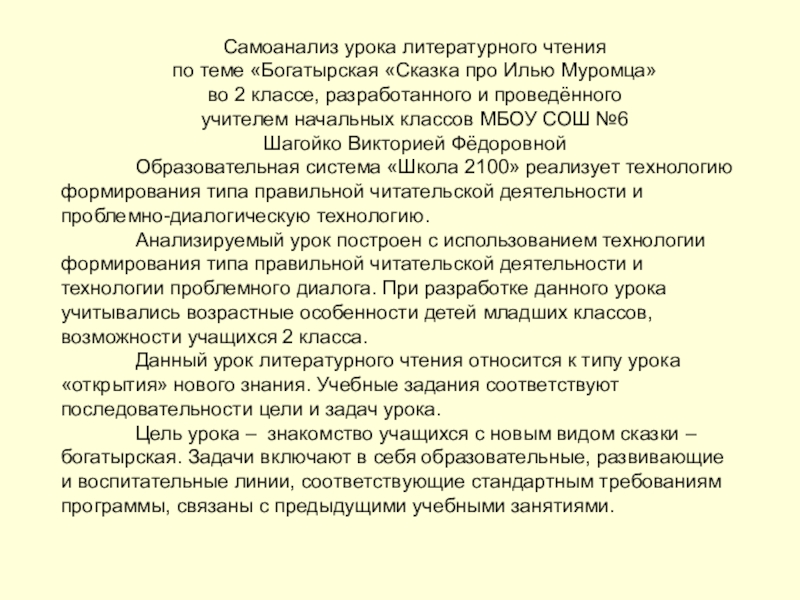 Анализируемый урок построен с использованием технологии формирования типа правильной читательской деятельности и технологии проблемного диалога. При разработке данного урока учитывались возрастные особенности детей младших классов, возможности учащихся 2 класса.