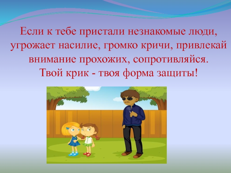 Слайд 10Если к тебе пристали незнакомые люди, угрожает насилие, громко кричи, привлекай