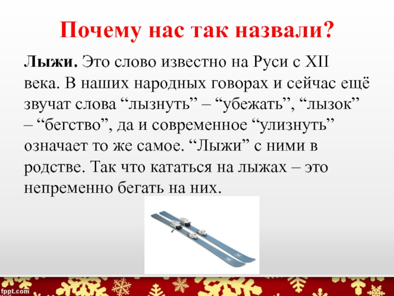 века. В наших народных говорах и сейчас ещё звучат слова “лызнуть” – “убежать”, “лызок” – “бегство”, да и современное “улизнуть” означает то же самое. “Лыжи” с ними в родстве. Так что кататься на лыжах – это непременно бегать на них.