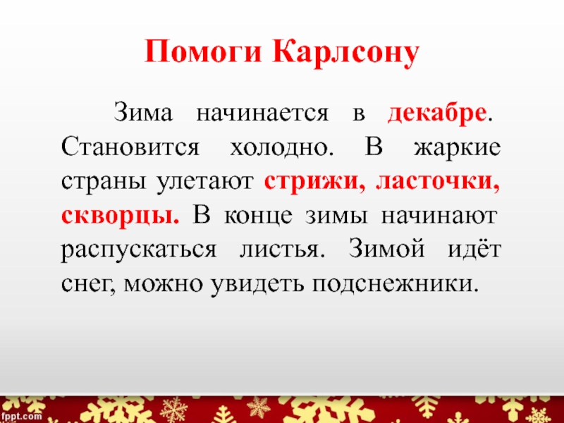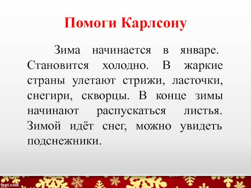 страны улетают стрижи, ласточки, скворцы. В конце зимы начинают распускаться листья. Зимой идёт снег. Прилетают снегири.