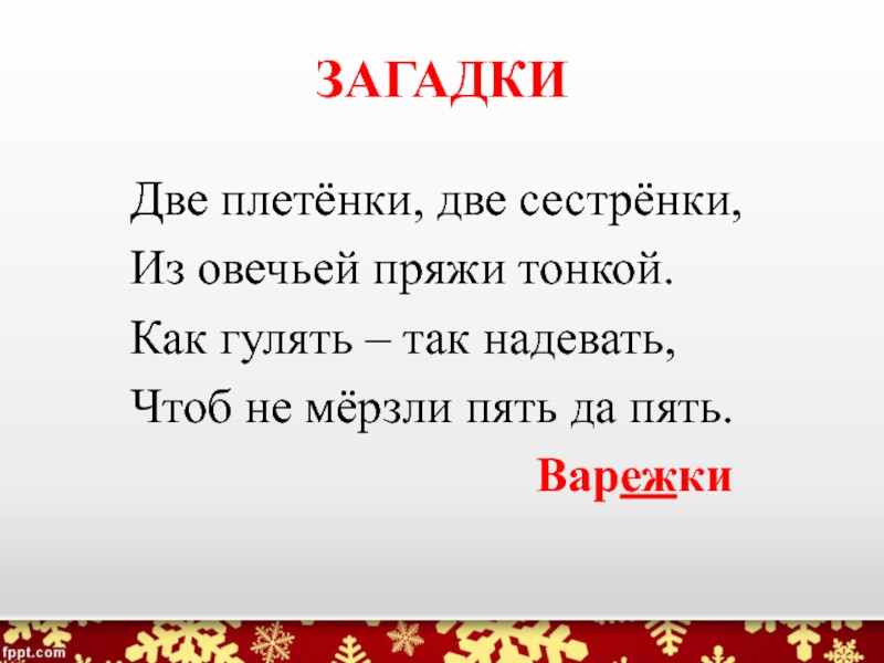 варить – «защищать», «беречь»). Теперь понятно, что варежки - это то, что защищает от холода. А вот ближайшие, более изящные родственницы варежек - перчатки название своё получили от слова перст - «палец» (отсюда перстень, напёрсток).