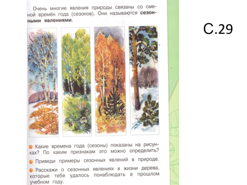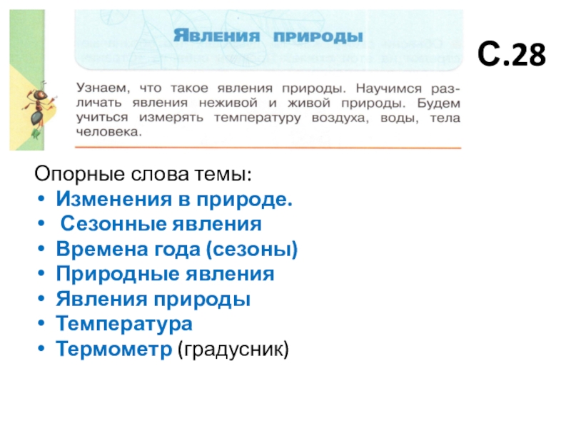 С.28Опорные слова темы:Изменения в природе. Сезонные явленияВремена года (сезоны)Природные явленияЯвления природыТемператураТермометр (градусник)