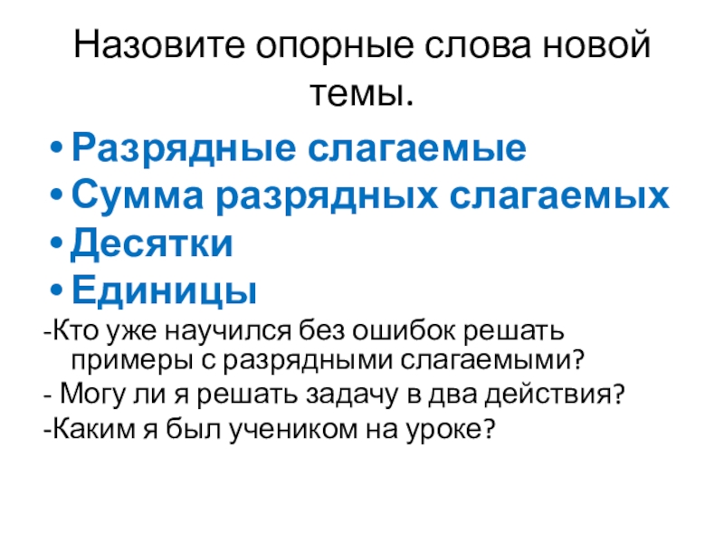 Назовите опорные слова новой темы.Разрядные слагаемыеСумма разрядных слагаемыхДесяткиЕдиницы-Кто уже научился без ошибок решать примеры с разрядными слагаемыми?-