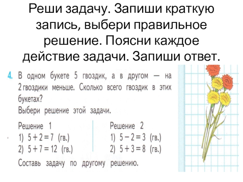 Слайд 5Реши задачу. Запиши краткую запись, выбери правильное решение. Поясни каждое действие