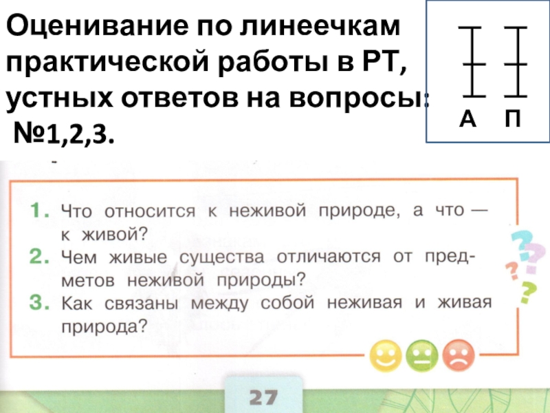 Оценивание по линеечкам  практической работы в РТ,  устных ответов на вопросы:  №1,2,3.А