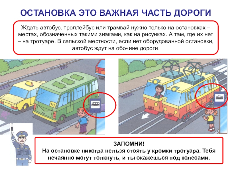 На остановке никогда нельзя стоять у кромки тротуара. Тебя нечаянно могут толкнуть, и ты окажешься под колесами.