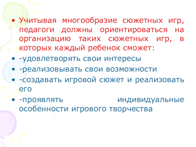 Слайд 27Учитывая многообразие сюжетных игр, педагоги должны ориентироваться на организацию таких сюжетных