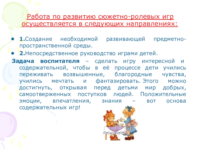 Задача воспитателя – сделать игру интересной и содержательной, чтобы в её процессе дети учились переживать возвышенные, благородные чувства, учились мечтать и фантазировать. Этого можно достигнуть, открывая перед детьми мир добрых, самоотверженных поступков людей. Положительные эмоции, впечатления, знания – вот основа содержательных игр!