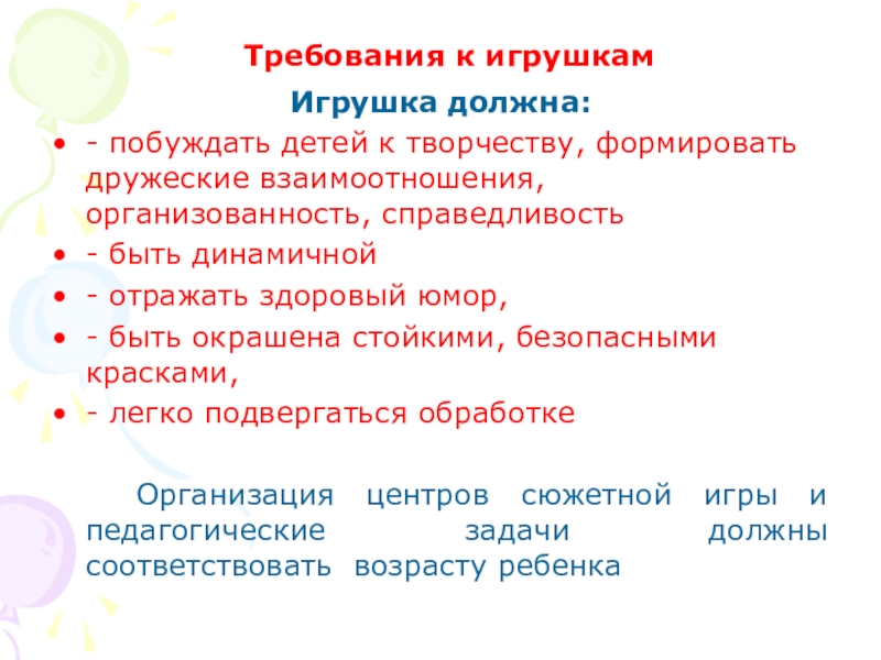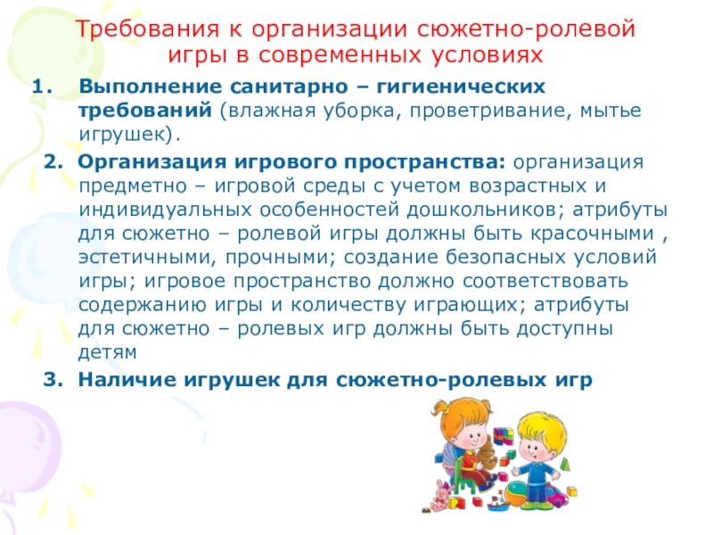 Слайд 15Требования к организации сюжетно-ролевой игры в современных условиях