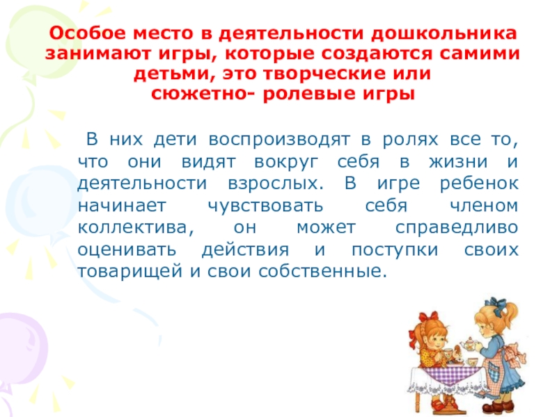 В них дети воспроизводят в ролях все то, что они видят вокруг себя в жизни и деятельности взрослых. В игре ребенок начинает чувствовать себя членом коллектива, он может справедливо оценивать действия и поступки своих товарищей и свои собственные.