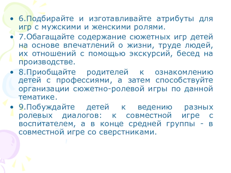 Слайд 306.Подбирайте и изготавливайте атрибуты для игр с мужскими и женскими ролями.