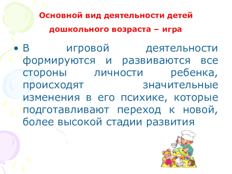 Слайд 4Основной вид деятельности детей дошкольного возраста – игра