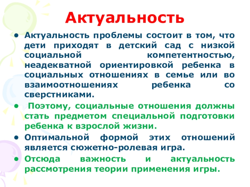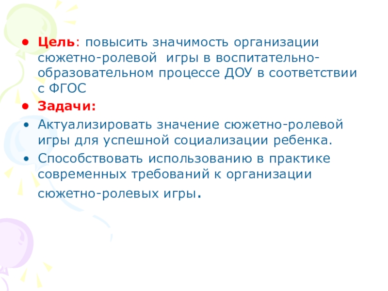 Актуализировать значение сюжетно-ролевой игры для успешной социализации ребенка.
