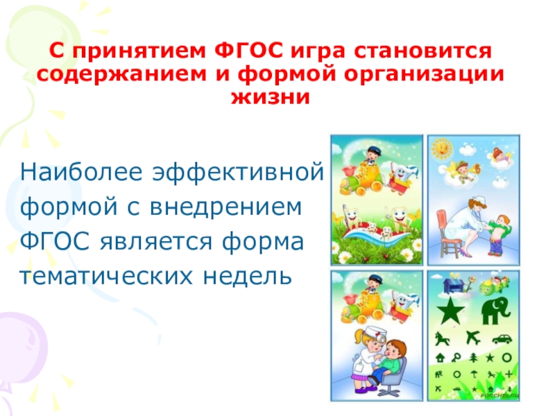 Слайд 6С принятием ФГОС игра становится содержанием и формой организации жизни