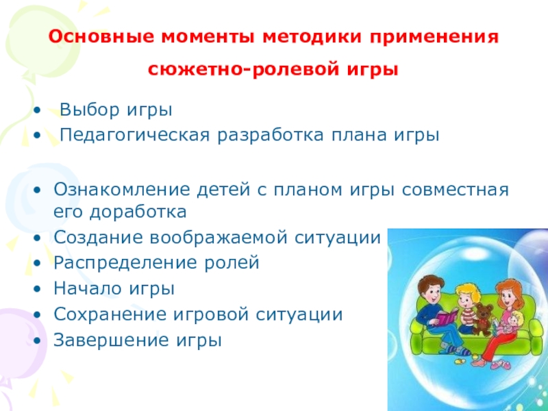 Слайд 7Основные моменты методики применения сюжетно-ролевой игры