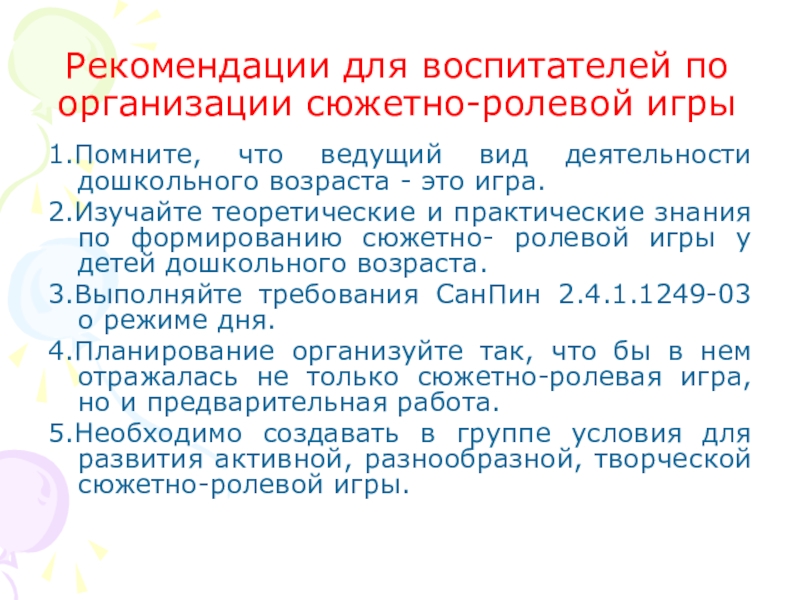Слайд 29Рекомендации для воспитателей по организации сюжетно-ролевой игры
