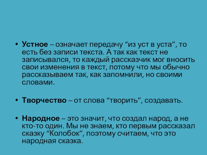 Народное – это значит, что создал народ, а не кто-то один. Мы не знаем, кто первым рассказал сказку “Колобок”, поэтому считаем, что это народная сказка.
