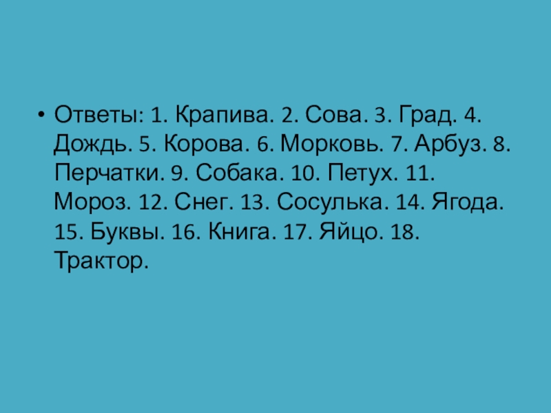 Ответы: 1. Крапива. 2. Сова. 3. Град. 4. Дождь. 5. Корова. 6. Морковь. 7. Арбуз. 8. Перчатки.