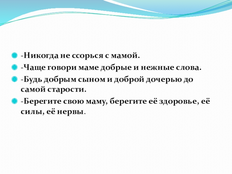 -Никогда не ссорься с мамой.-Чаще говори маме добрые и нежные слова.-Будь добрым сыном и доброй дочерью до