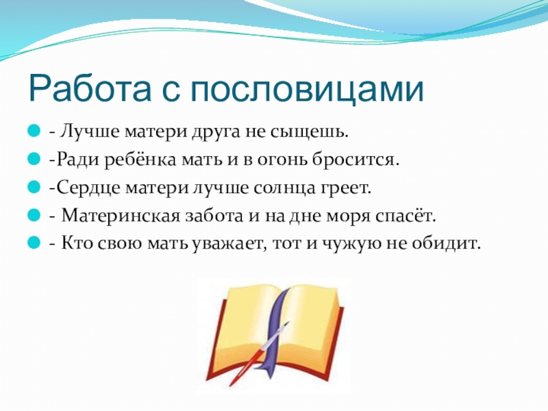 Работа с пословицами- Лучше матери друга не сыщешь.-Ради ребёнка мать и в огонь бросится.-Сердце матери лучше солнца