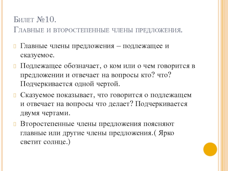 Второстепенные члены предложения поясняют главные или другие члены предложения.( Ярко светит солнце.)