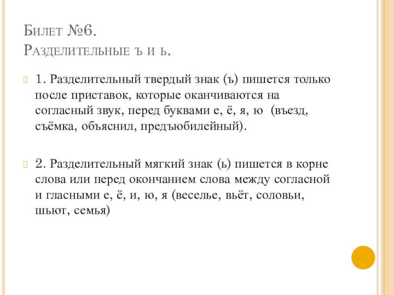 2. Разделительный мягкий знак (ь) пишется в корне слова или перед окончанием слова между согласной и гласными е, ё, и, ю, я (веселье, вьёт, соловьи, шьют, семья)