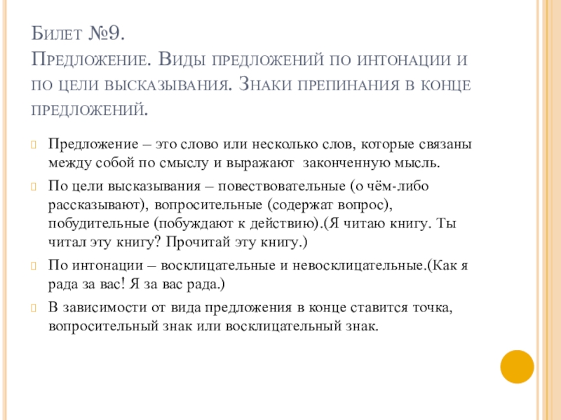 Предложение. Виды предложений по интонации и по цели высказывания. Знаки