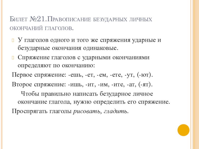 Слайд 21Билет №21.Правописание безударных личных окончаний глаголов.