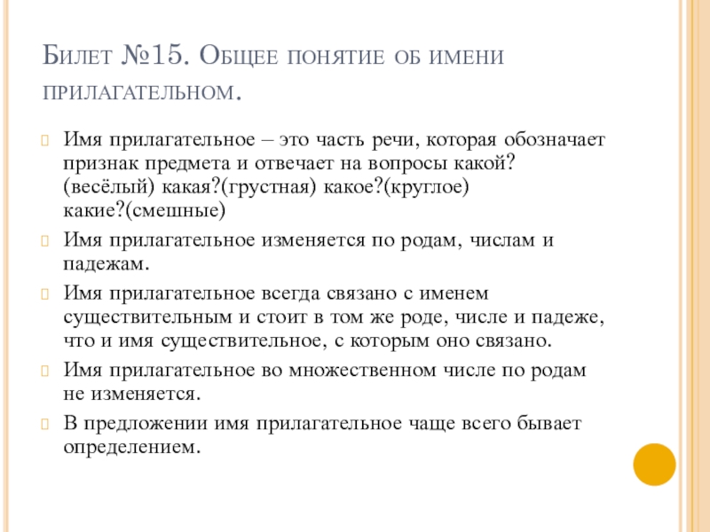 Слайд 15Билет №15. Общее понятие об имени прилагательном.