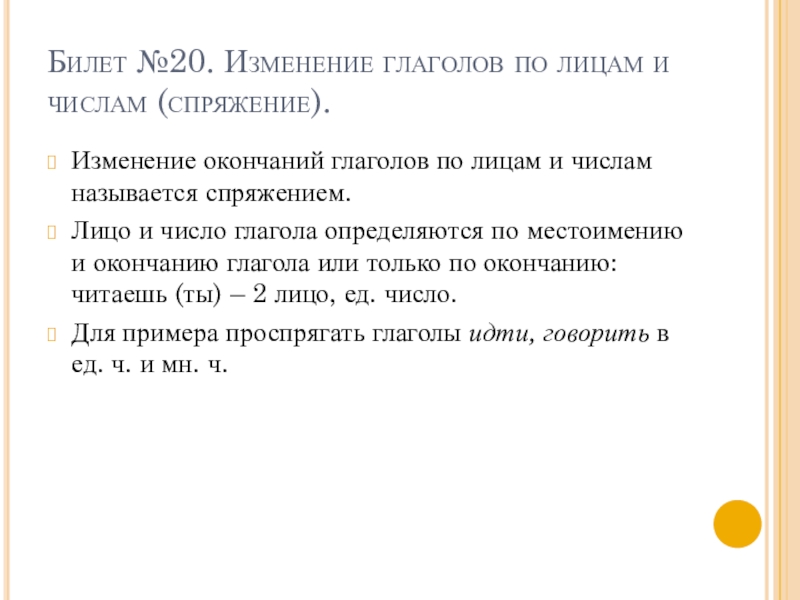 Слайд 20Билет №20. Изменение глаголов по лицам и числам (спряжение).