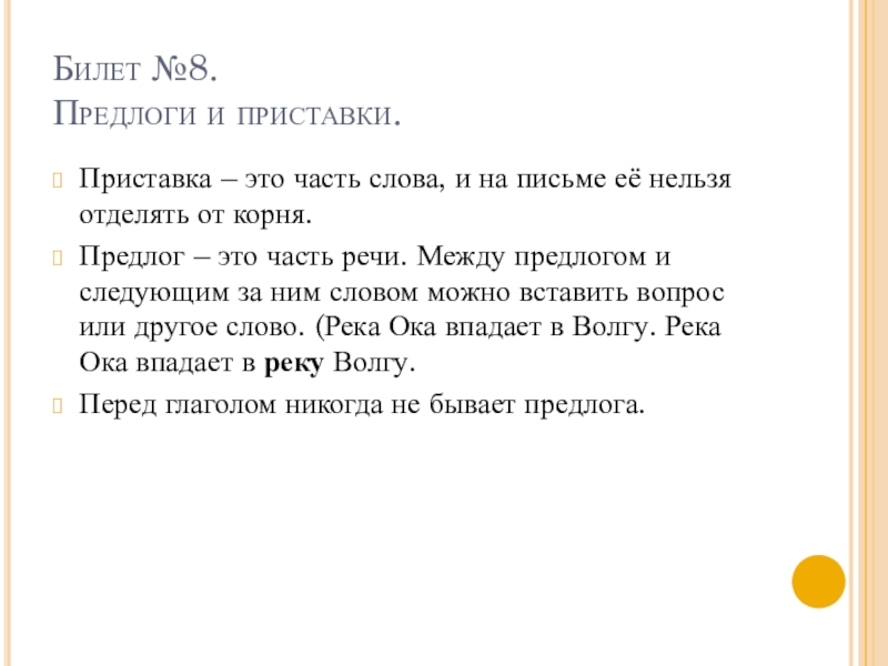 Предлог – это часть речи. Между предлогом и следующим за ним словом можно вставить вопрос или другое слово. (Река Ока впадает в Волгу. Река Ока впадает в реку Волгу.