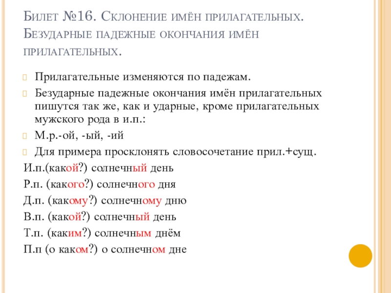 Слайд 16Билет №16. Склонение имён прилагательных. Безударные падежные окончания имён прилагательных.