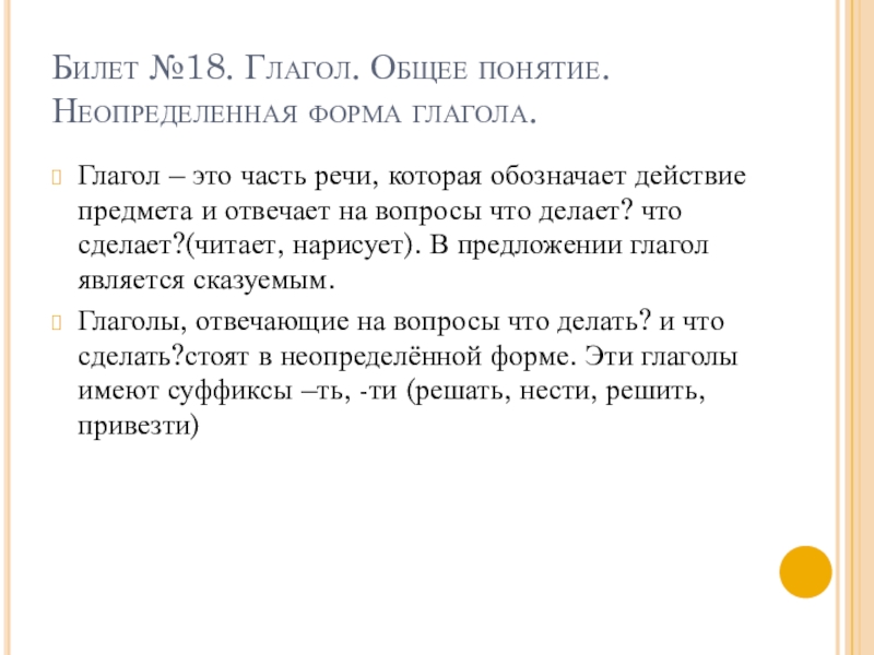 Слайд 18Билет №18. Глагол. Общее понятие. Неопределенная форма глагола.