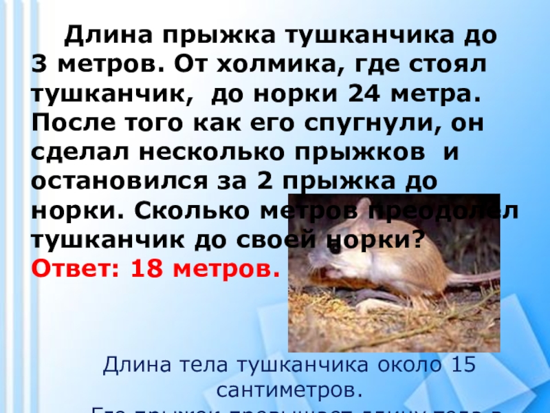 Длина прыжка тушканчика до 3 метров. От холмика, где стоял тушканчик, до норки 24 метра. После того как его спугнули, он сделал несколько прыжков и остановился за 2 прыжка до норки. Сколько метров преодолел тушканчик до своей норки?