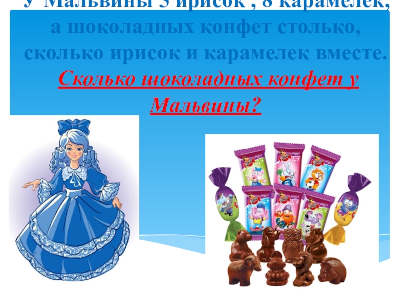 Слайд 9У Мальвины 5 ирисок , 8 карамелек, а шоколадных конфет столько,