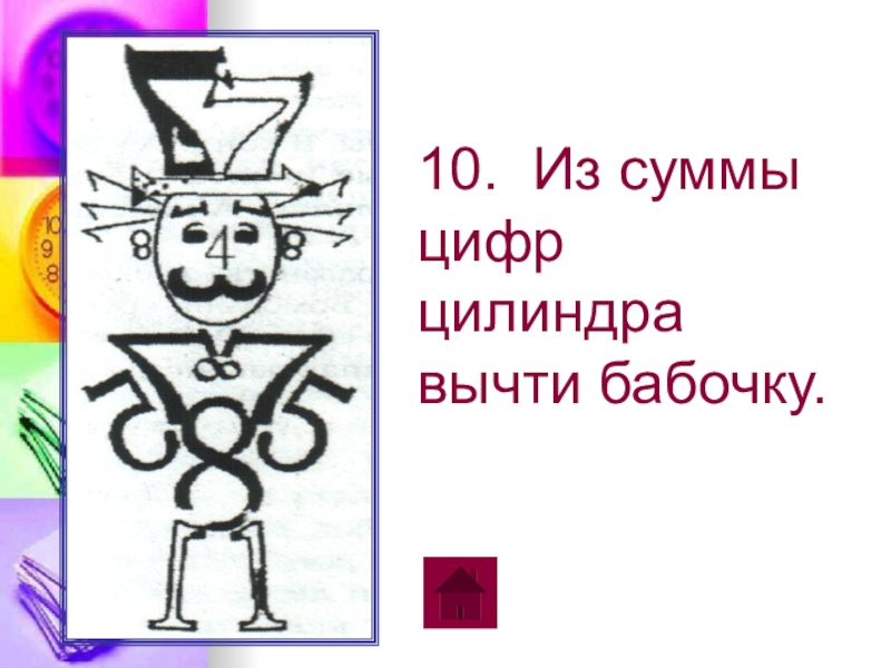 10. Из суммы цифр цилиндра вычти бабочку.