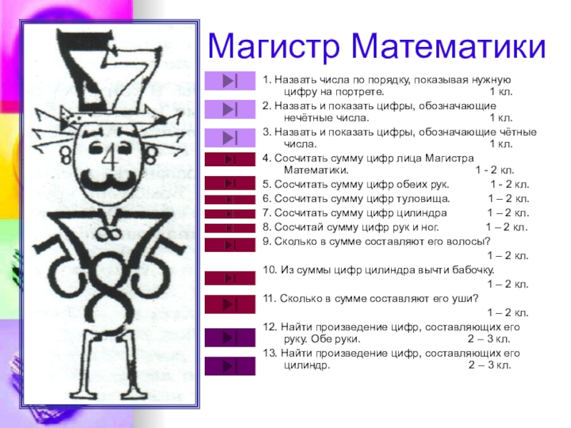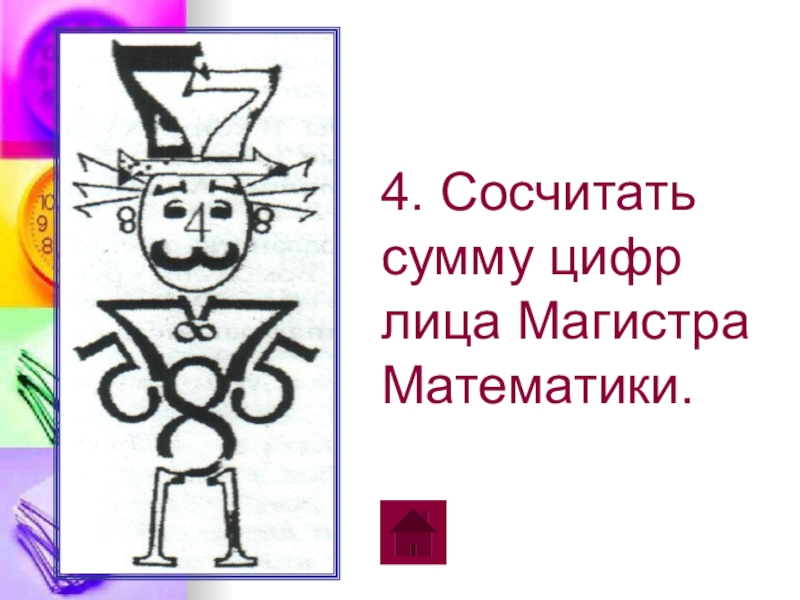 4. Сосчитать сумму цифр лица Магистра Математики. 1 - 2 кл.