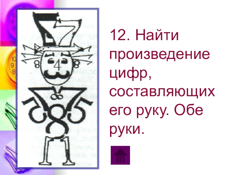 12. Найти произведение цифр, составляющих его руку. Обе руки. 2 – 3 кл.