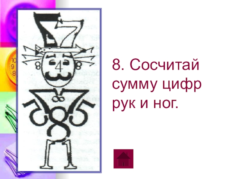 8. Сосчитай сумму цифр рук и ног. 1 – 2 кл.