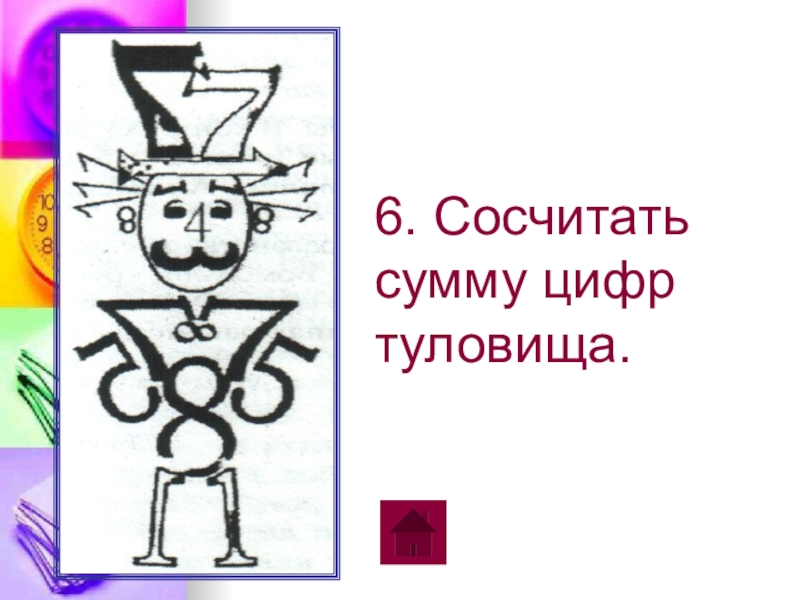6. Сосчитать сумму цифр туловища. 1 – 2 кл.