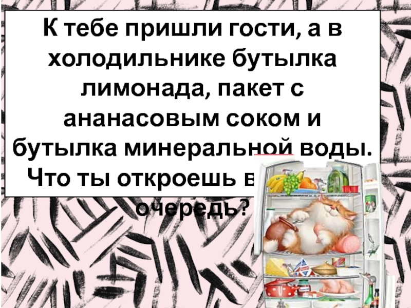 К тебе пришли гости, а в холодильнике бутылка лимонада, пакет с ананасовым соком и бутылка минеральной воды. Что ты откроешь в первую очередь?