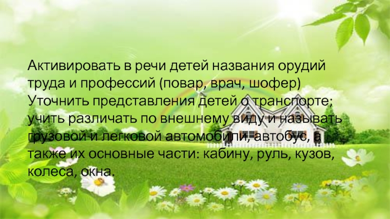 Уточнить представления детей о транспорте; учить различать по внешнему виду и называть грузовой и легковой автомобили, автобус, а также их основные части: кабину, руль, кузов, колеса, окна.
