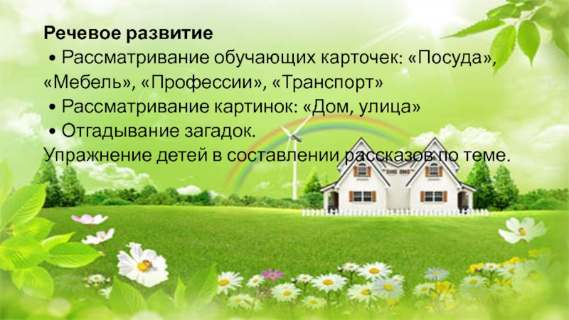 • Рассматривание обучающих карточек: «Посуда», «Мебель», «Профессии», «Транспорт»
