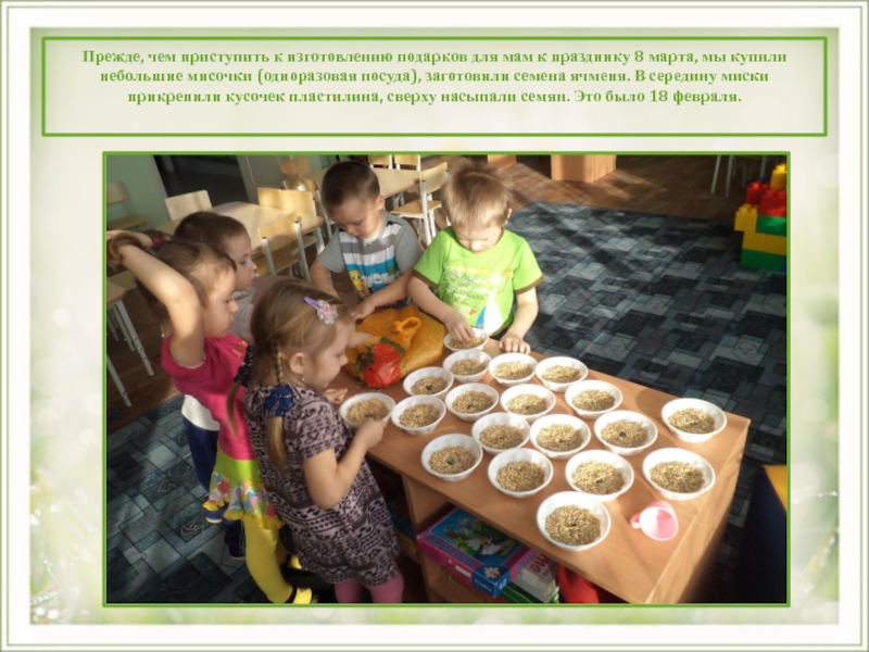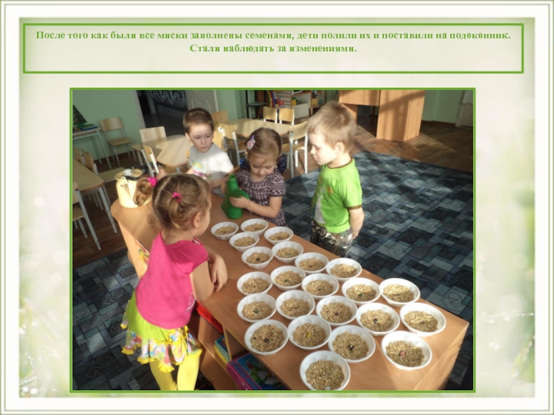 Слайд 5 После того как были все миски заполнены семенами, дети полили их