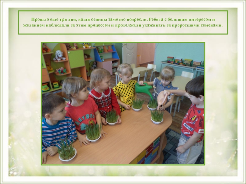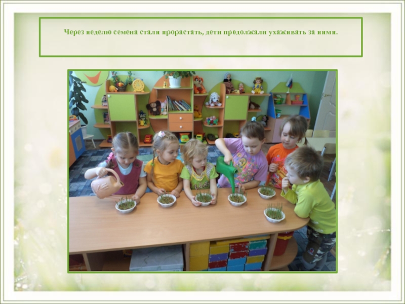 Слайд 6 Через неделю семена стали прорастать, дети продолжали ухаживать за ними.
