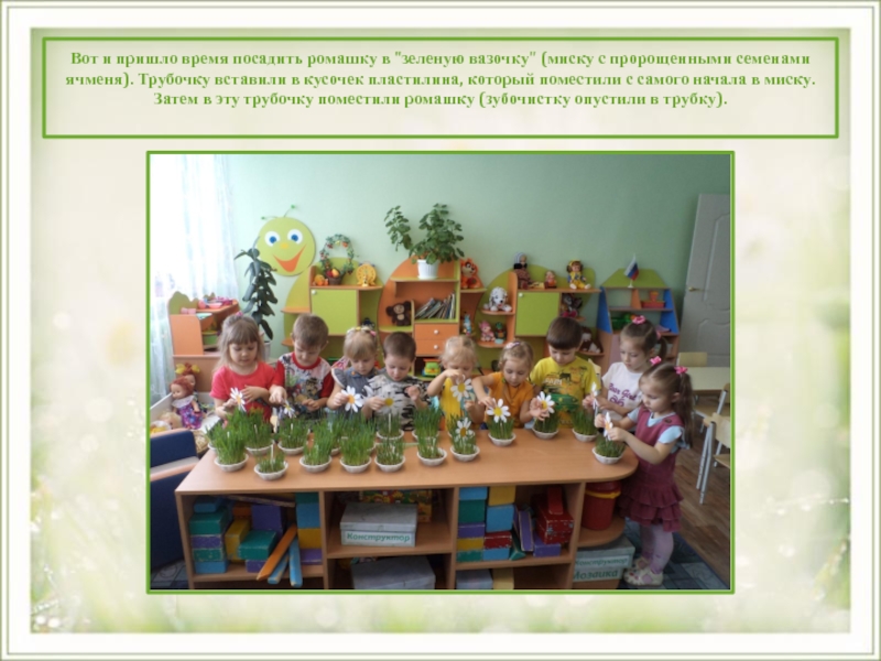 Слайд 9Вот и пришло время посадить ромашку в "зеленую вазочку" (миску с