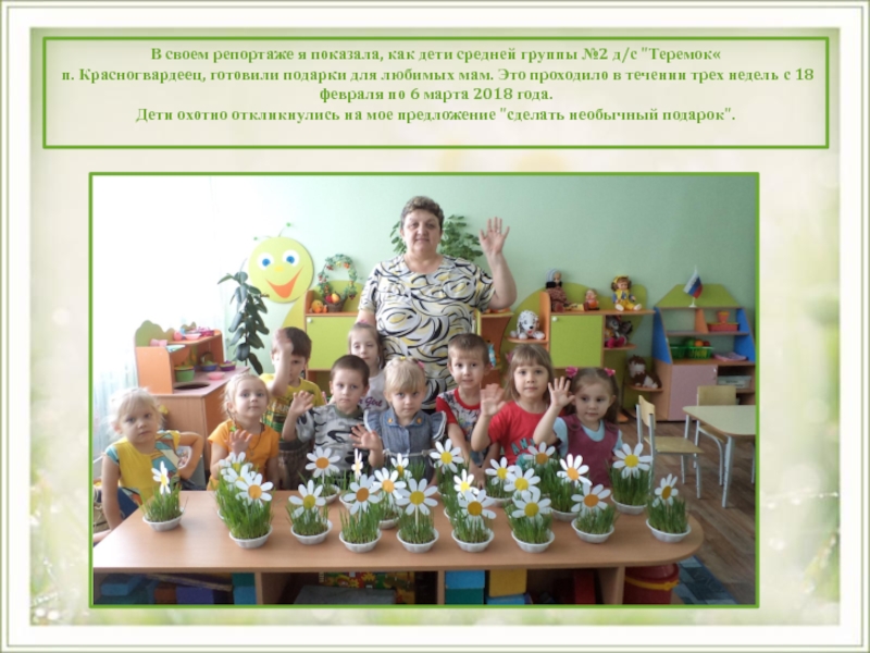 "Теремок« п. Красногвардеец, готовили подарки для любимых мам. Это проходило в течении трех недель с 18 февраля по 6 марта 2018 года.  Дети охотно откликнулись на мое предложение "сделать необычный подарок".