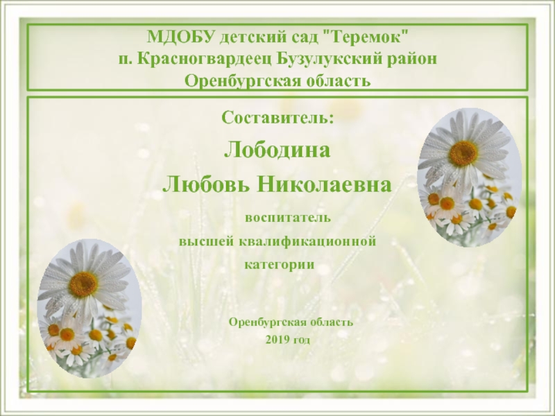 МДОБУ детский сад "Теремок" п. Красногвардеец Бузулукский район Оренбургская область Составитель: Лободина Любовь Николаевна воспитатель высшей квалификационной категории  Оренбургская область 2019 год