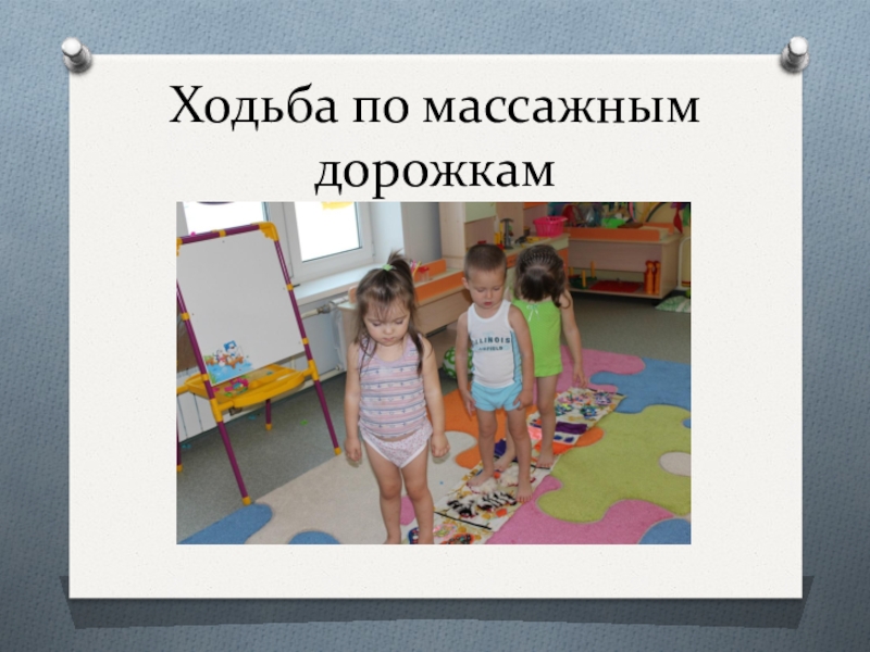Слайд 16Ходьба по массажным дорожкам.