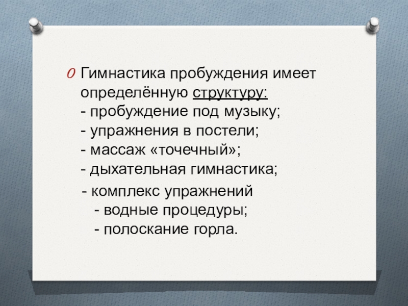 Гимнастика пробуждения имеет определённую структуру: - пробуждение под музыку; - упражнения в постели; - массаж «точечный»; -